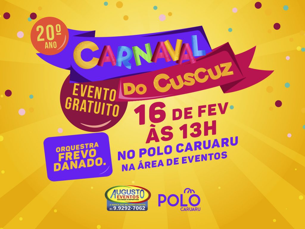 Depois de animar a turminha mirim, o Polo Caruaru recebe uma das mais tradicionais prévias carnavalescas da cidade. A 20ª edição do Carnaval do Cuscuz será neste domingo (16), a partir das 13h, na Área de Eventos. Quem vai animar a festa é a Orquestra Frevo Danado. Tudo de graça! “Esta é uma das mais […]