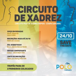 Caruaru sediará, neste domingo (24), a 4ª etapa do Circuito PE21 de Xadrez Rápido. Promovida pela Federação Pernambucana de Xadrez, a competição acontecerá no Polo